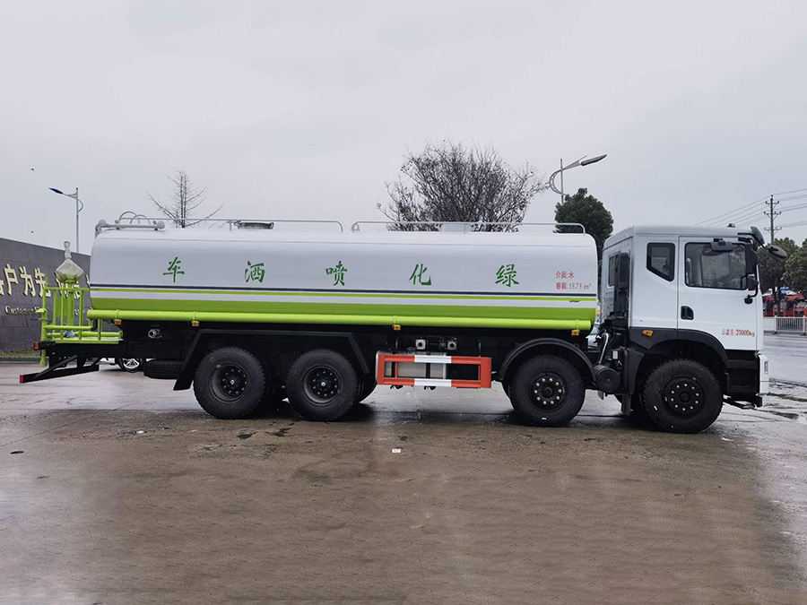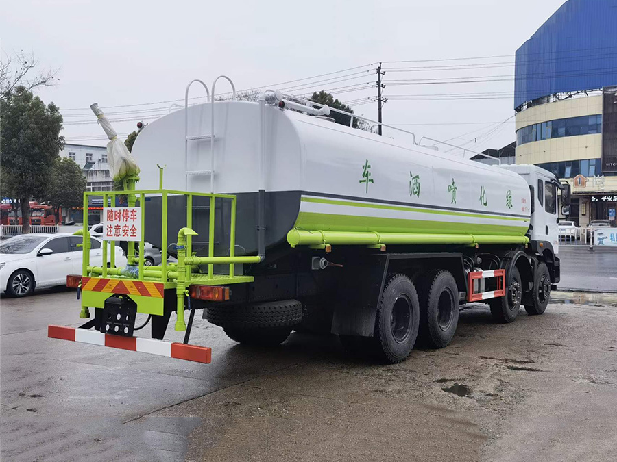 上裝配置簡要介紹:罐體采用標準Q235碳鋼制作,罐體自動焊,裝水25噸,配大功率專用灑水車,可自吸自排,前沖后灑,側噴,高位花灑,主管道加粗,大通徑球閥,直通球閥式消防接口,帶后工作平臺,沖孔平臺,帶高炮。(可選裝大平臺,可裝30米霧炮降塵)。環保,免征齊全。