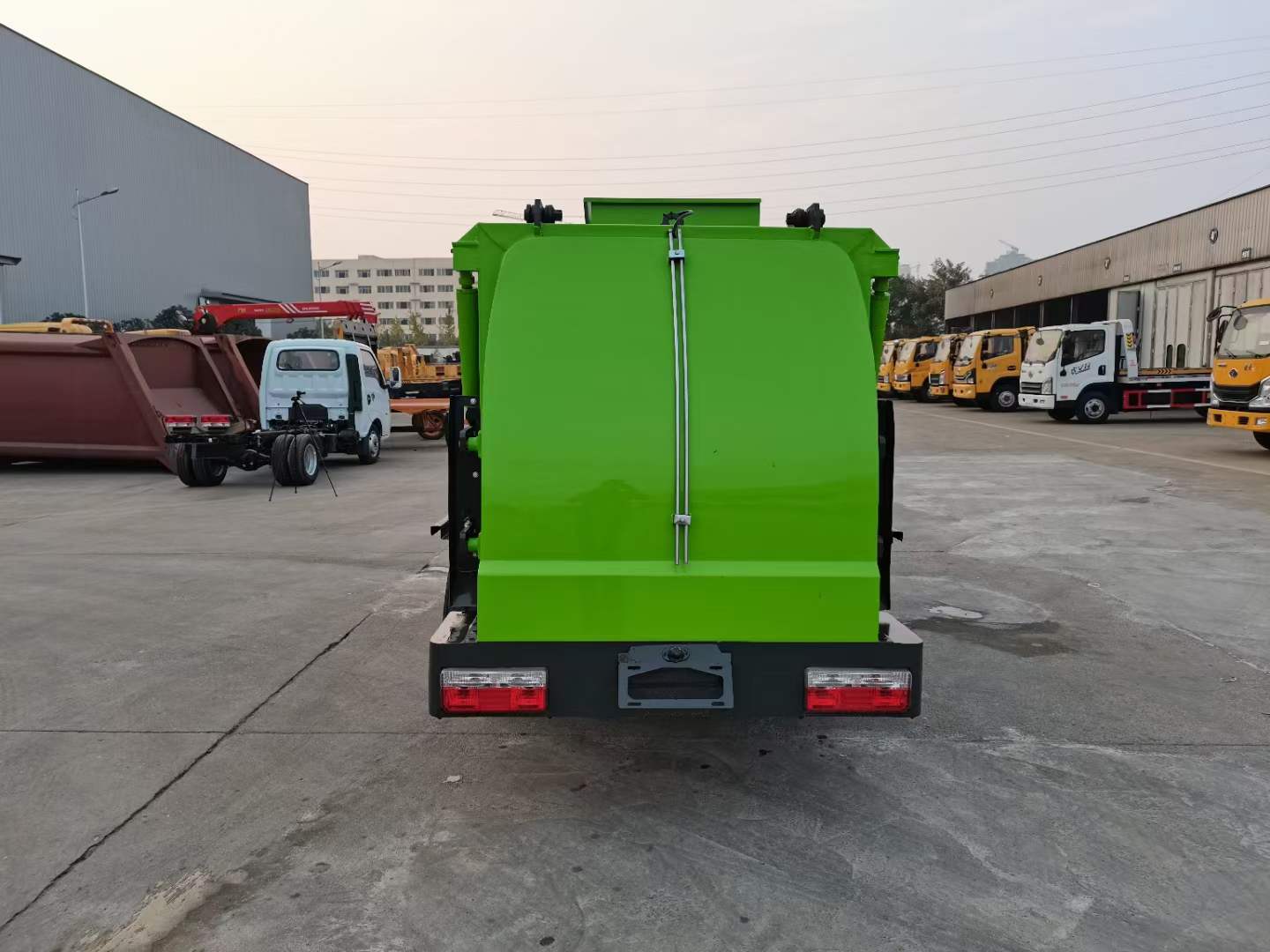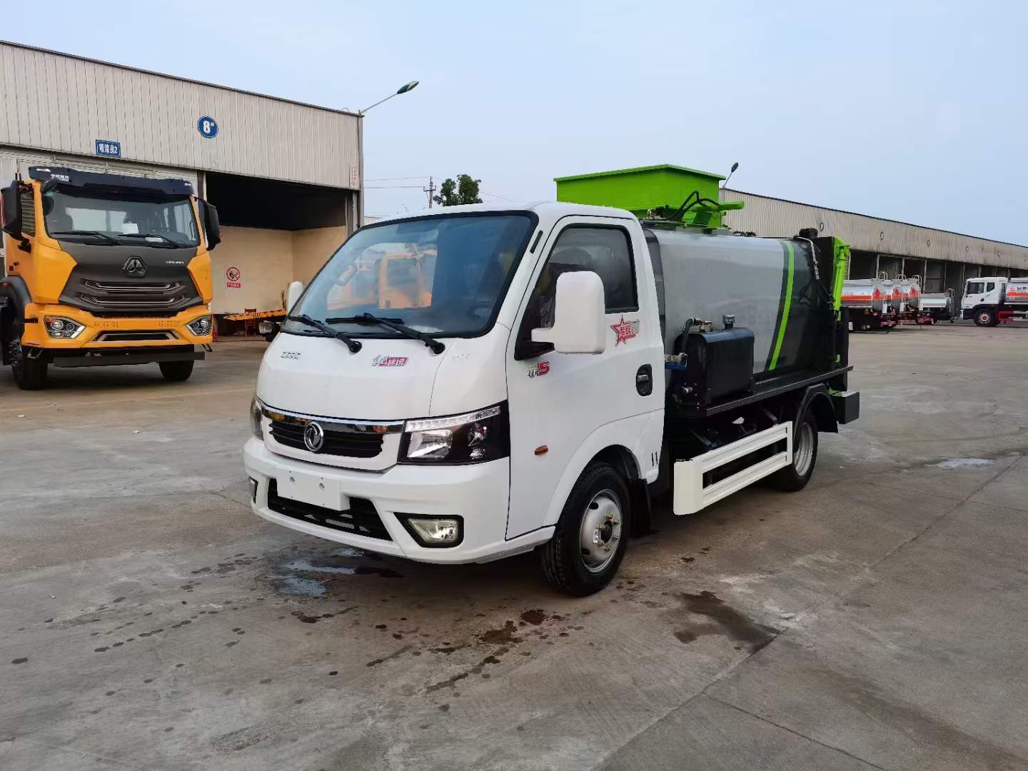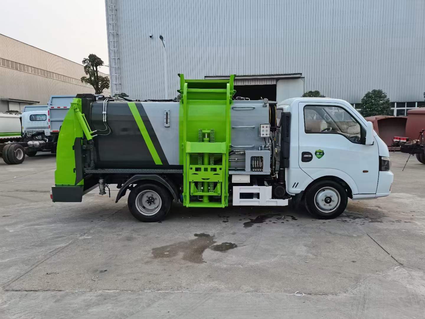 底盤配置:東風途逸(國六)軸距:2800mm,1650/單排,全柴Q23-95E60(95馬力),5檔變速箱,185R14真空輪胎-后雙輪,前后橋1.5/3。標配動力轉向,前盤制動,中控門鎖,電動門窗,定速巡航,藍牙電話,LED日間行車燈,ABS,空調,預留取力器窗口。上裝配置:箱體采用T700高強度耐厚鋼,邊2底2,容積4立方,嘉善取力器,合肥油泵;江蘇多路閥;國產液壓油缸;帶推鏟卸料功能(不帶舉升),擠壓干濕分離,尾部大梁上左右各安裝一個出口帶消防接口;液壓后蓋,后蓋帶密封條,后蓋液壓鎖緊;雙鏈條提升機;可掛120/240L標準塑料垃圾桶;駕駛室內集中電控(提升機外部手動控制);后門鎖緊與后蓋開關的操作具有防誤操作,提升機與上蓋、推鏟具有防誤操作;帶高壓清洗功能,液壓馬達,清洗泵,自回位巻盤,水槍;車身高位示廓燈/邊燈/作業照明燈。電控操作功能。可選裝遙控器操作。