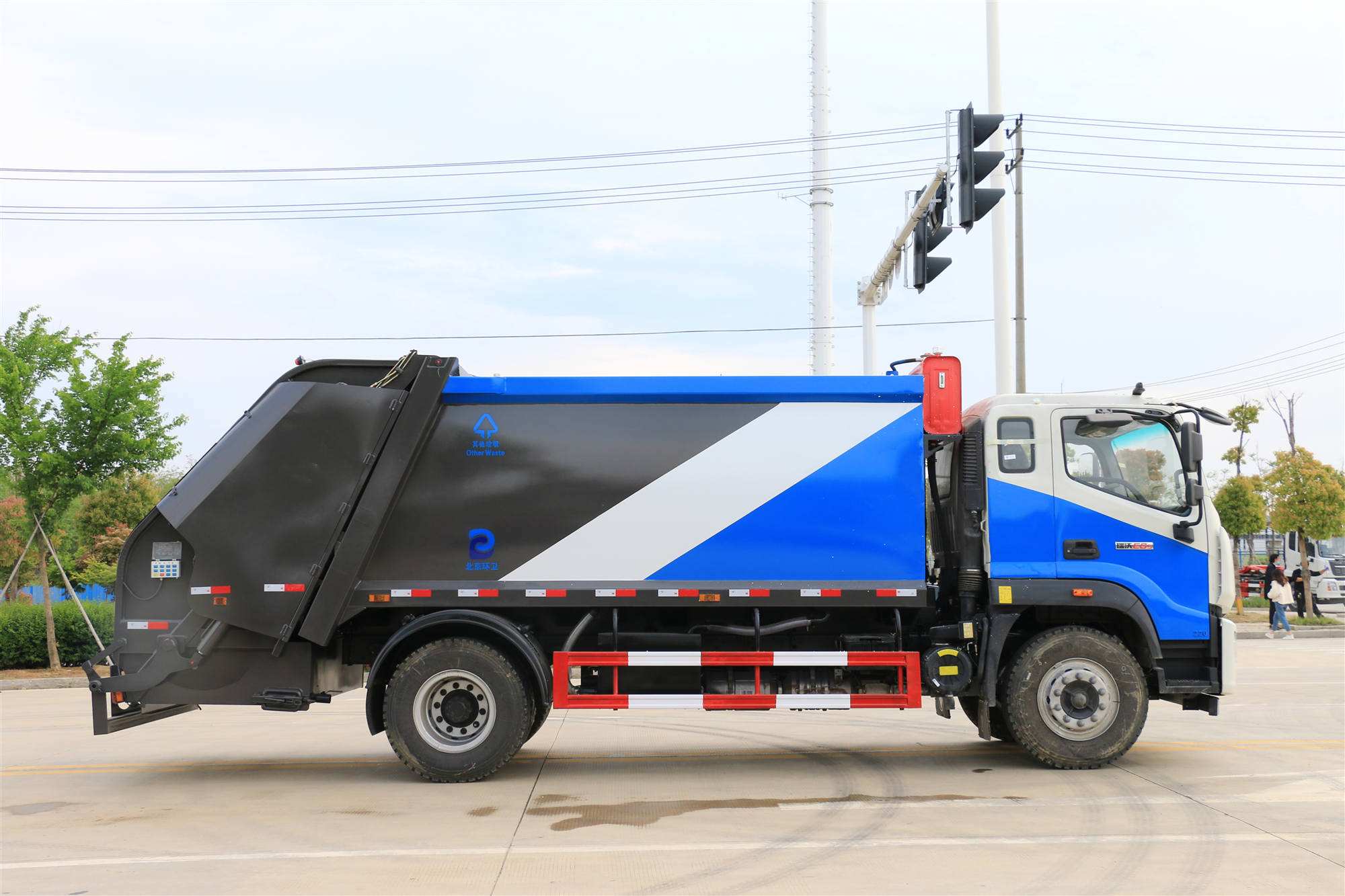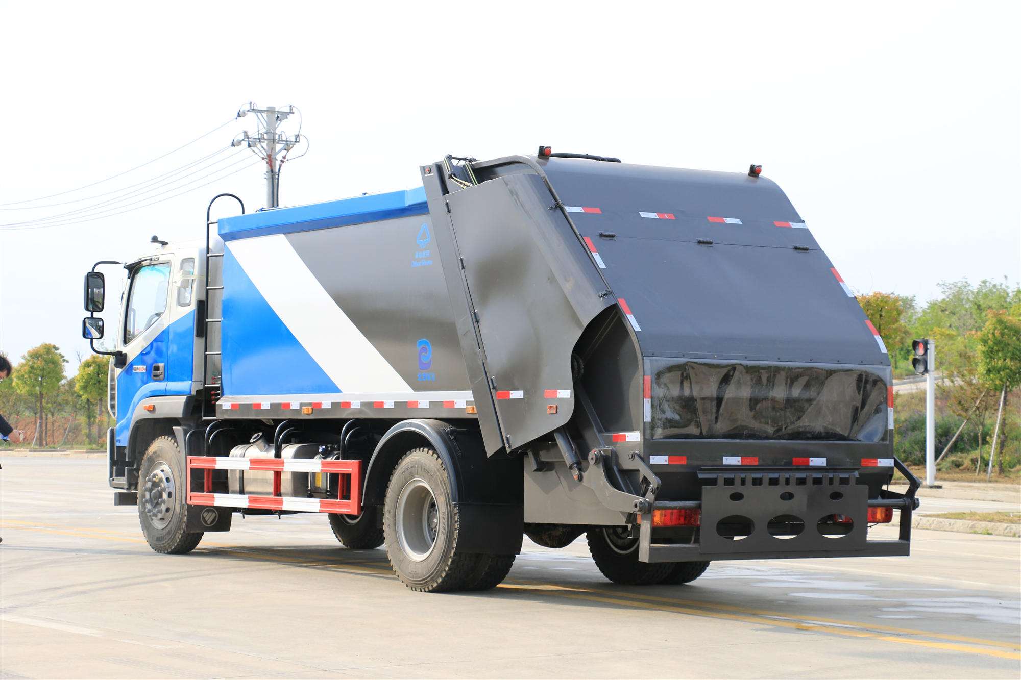 上裝配置:1,新款弧形箱體,增加箱體容積,整車更美觀,箱體為碳鋼制作,底箱及填充器采用加厚鋼板,耐腐蝕使用壽命長,一層油漆噴涂處理。2,裝載循環時間=25S;垃圾排出時間≤25S;填料提升角度≥95°,壓縮比例為1/3-1/2,一裝部分具備雙向壓縮和蠕動壓縮功能帶。3,新款結構加大填充器,手電一體操作模式,帶駕駛室操作,帶駕駛室一鍵卸料功能,3308軸距以上配遠距離遙控器,尾部裝置可以選裝垃圾翻轉斗,掛桶翻轉板或者大落地斗。4,CAN總線控制方式,光電開關加延時雙系統控制,降低故障率,方便維修。5,帶夜間照明裝置,6方)及以上車型帶雙污水箱,污水箱排水球閥和排水蓋,增加排水管,防止濺水,人性化設計。6,標配選用:威森搏樂油缸,威森搏樂多路閥,3308軸距以上配備壓實閥(背壓閥),所有車型標配單泵。5000軸距、后八輪車型標標配雙聯泵,大油量多路閥。