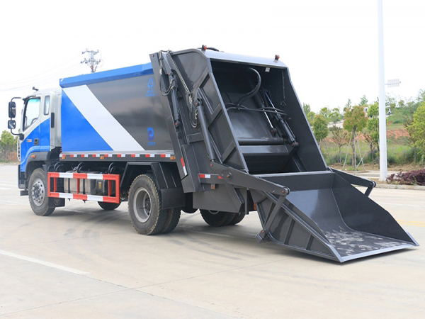 選裝配置:大落地斗,帶后擺臂,另帶單一掛桶裝置,尾部密封蓋手動/氣缸控制,雙聯泵(多路閥聯數增加,液壓泵加大,液壓油箱加大)