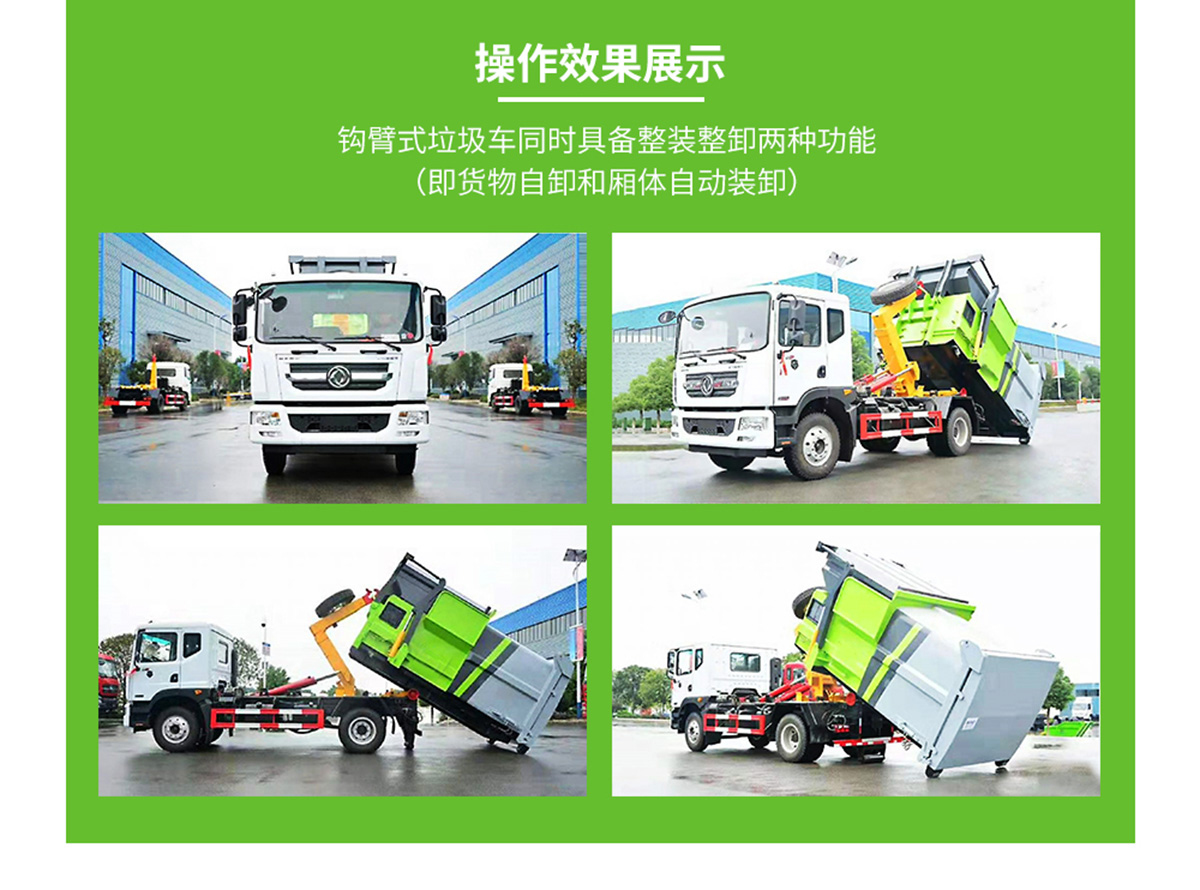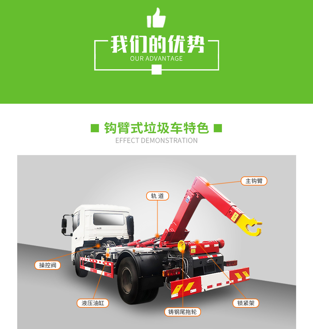 勾臂垃圾車標配:由液壓系統、操作系統、拉臂,組成。舉升油制缸為國內知名液壓件廠家生產的雙作用油缸,多路閥液壓控制,操作員手動控制垃圾廂吊上放下,帶自卸功能,上下一次工作循環時間≤40秒。垃圾箱冷板壓制垃圾箱,帶后門密封圈,帶金屬滾動輪。