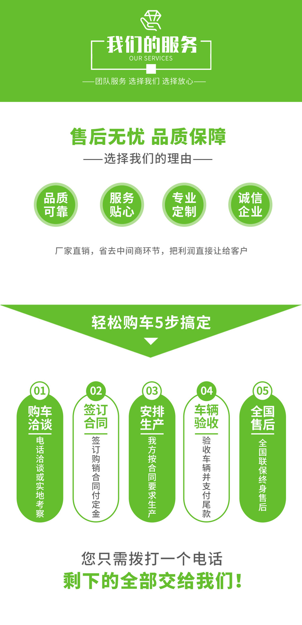 一.凡我公司生產的專用汽車,將實行終身服務。在“三包”期內改裝部分出現的質量問題,將進行免費維修。“三包”期后發生的問題,我公司會在第一時間里組織維修,視情況收取成本費。